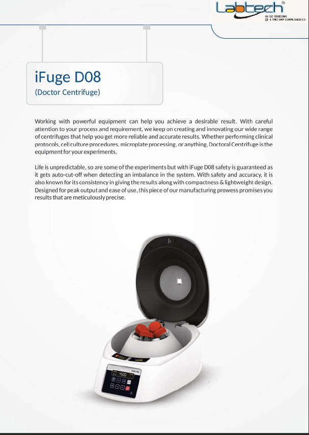 The Doctor Centrifuge is a compact, high-speed laboratory centrifuge designed for efficient separation of biological and chemical samples. Equipped with a powerful brushless DC motor and intelligent digital control, it ensures accurate, stable, and quiet operation — making it ideal for clinical, research, and medical laboratory use.