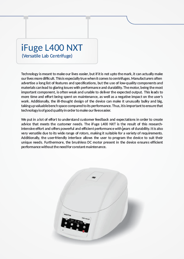 The iFuge L400 NXT is a next-generation, high-performance laboratory centrifuge designed for versatility, precision, and durability. Built with a brushless DC motor, intelligent microprocessor control, and universal rotor compatibility, it delivers consistent, efficient separations for a wide range of laboratory applications — from clinical to research environments.